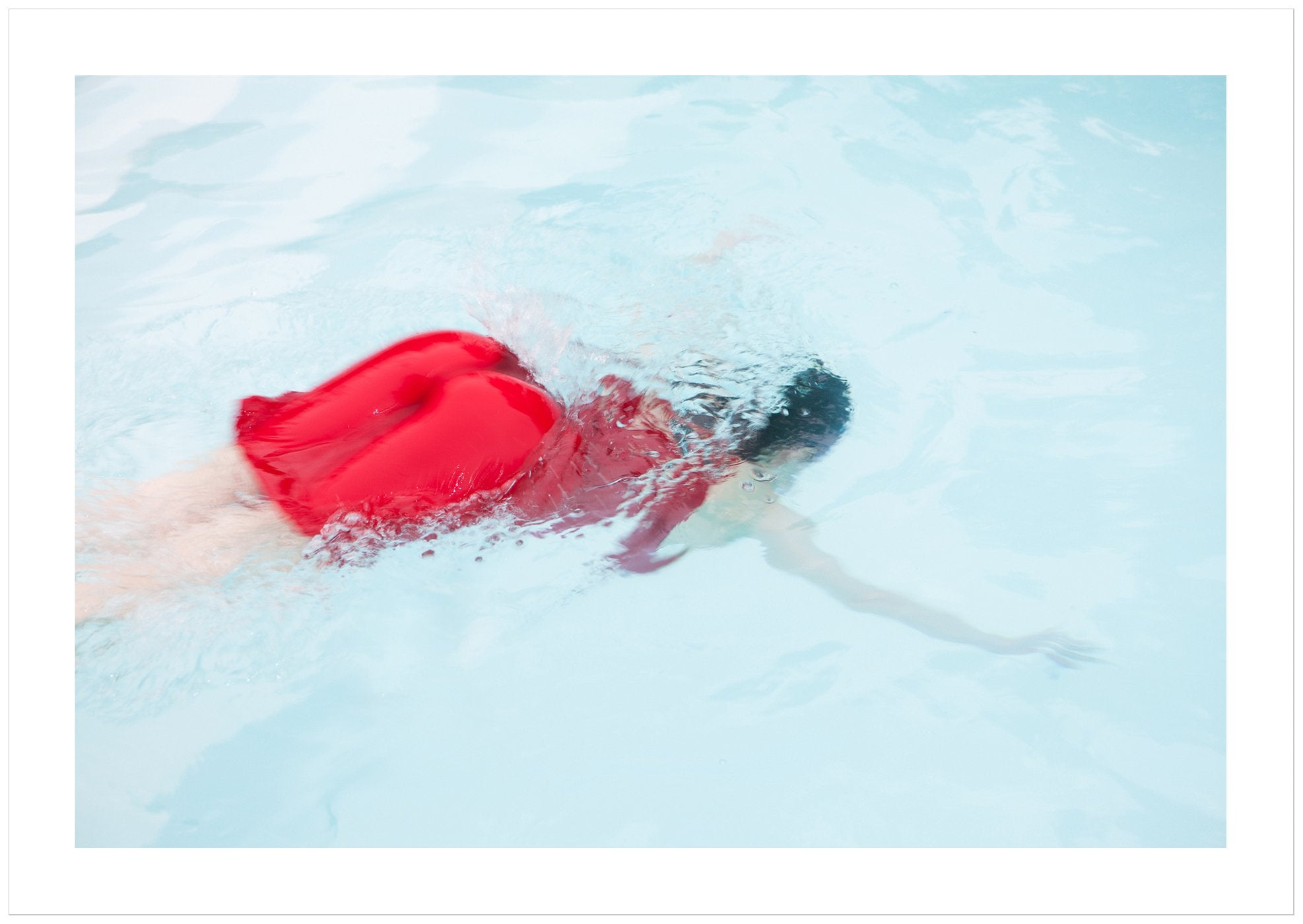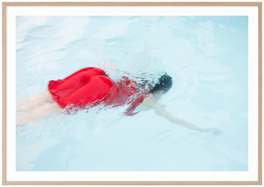 Apple, poster. Färgfotografi av en kvinna i röd klänning som dyker ner i en ljusblå swimmingpool. Poster med vit yta runtom bilden som framhäver motivet. Väljer du till ram och passepartout i samma storlek passar allt perfekt ihop. Ram och passepartout ingår ej.